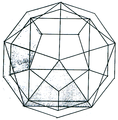2. Pentagon-Dodekaeder: Fünfeck-Zwölfflächner, gebildet aus zwölf regelmäßigen Fünfecken, deren Mittelpunkte auf denselben Kugelradien liegen wie die Ecken des Ikosaeders. Die 20 Ecken dieses Gebildes berühren die Mittelpunkte der 20 Ikosaeder-Dreiecke.
