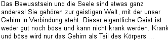 - Im Zuge der Entstehung des Lebens und der Evolution entstanden körperliche Eigenschaften und psychische. Die psychischen Eigenschaften und unser Verhalten stammen nicht vom Geist, dem Bewusstsein, vielmehr entstehen sie durch elektrische und chemische Impulse in unserem Gehirn, sind also körperlich! Gehirnschäden durch Unfall, Schlaganfall etc. können zu völlig verändertem Verhalten führen und aus jemandem "einen ganz anderen Menschen" machen. Das Ich, der Geist ist aber immernoch der gleiche, er wurde nicht verletzt. Letzlich sind wir, als unser bewusstes Selbst, nur Zuschauer bei dem, was unser Gehirn macht. Ob wir darauf (auch) einen Einfluss haben, ist umstritten. Wer es einfach behauptet, erliegt seinem Wunschdenken. Auch eine Computer-Software kann man dazu bringen, psychisch zu reagieren, scheinbar gute oder schlechte Laune zu haben, traurig oder lustig zu antworten, deshalb hat sie noch lange keine Seele, oder vielleicht doch? Niemand weiß es.